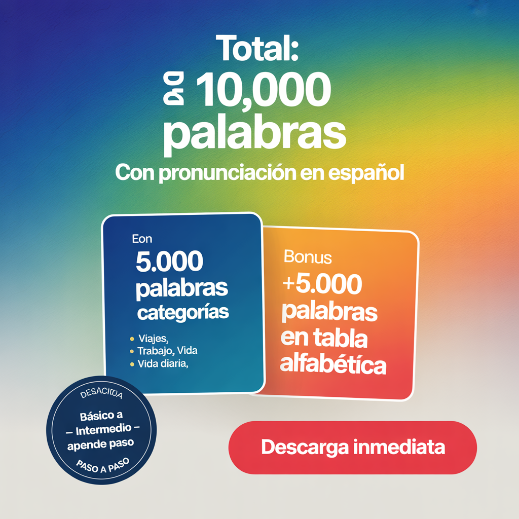 Todo el contenido está diseñado en PDF con estructura limpia, ejemplos simples y pronunciación adaptada al español.